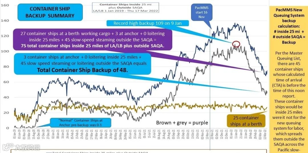 在之前《圣诞旺季,港口不塞了?!美西双港堵着近百艘“僵尸船”!》提到,该方案只是将集装箱船转移到“地平线”上,事实上,在南加州港口等待泊位的船只在 2022 年 1 月 9 日仍达到了 109 艘集装箱船的历史新高。