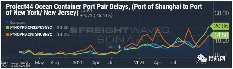 根据eeSea的数据,2020年亚洲-美东航线平均延误2.1天,而在2022年的前三个月,平均延误时间增至9.3天。2020年全年,该航线准班率平均为37.5%;今年前三个月下降到了9.3%。