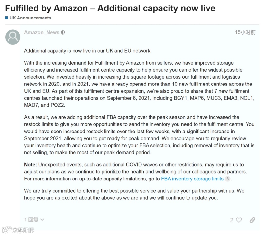 亚马逊似乎也听到卖家苦盼爆单的心声,据了解,欧洲站出台了FBA新政,进一步放宽了补货限制。日前,亚马逊欧洲站发布公告:随着卖家的物流需求量不断增加,亚马逊提高了存储效率并增加了运营中心容量,助力卖家备战旺季销售。