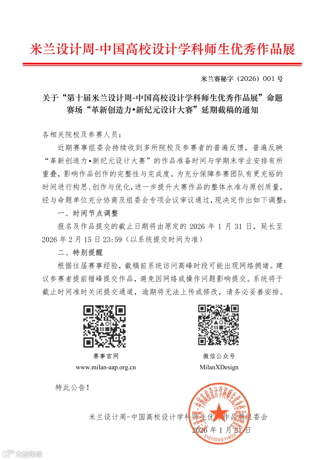 报名及作品提交的截止日期将由原定的2026年1月31日,延长至2026年2月15日23:59(以系统提交时间为准)。