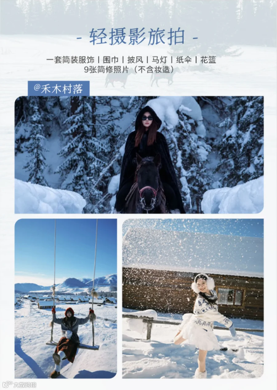 禾木安排轻摄影旅拍,赠送9张简修照片(不含妆造,旅拍提供美拍小道具: 简装服饰/雪具服/骏马/围巾/披风/马灯/纸伞/花篮)(禾木旅拍为赠送项目,不参与恕不退费,感谢理解)