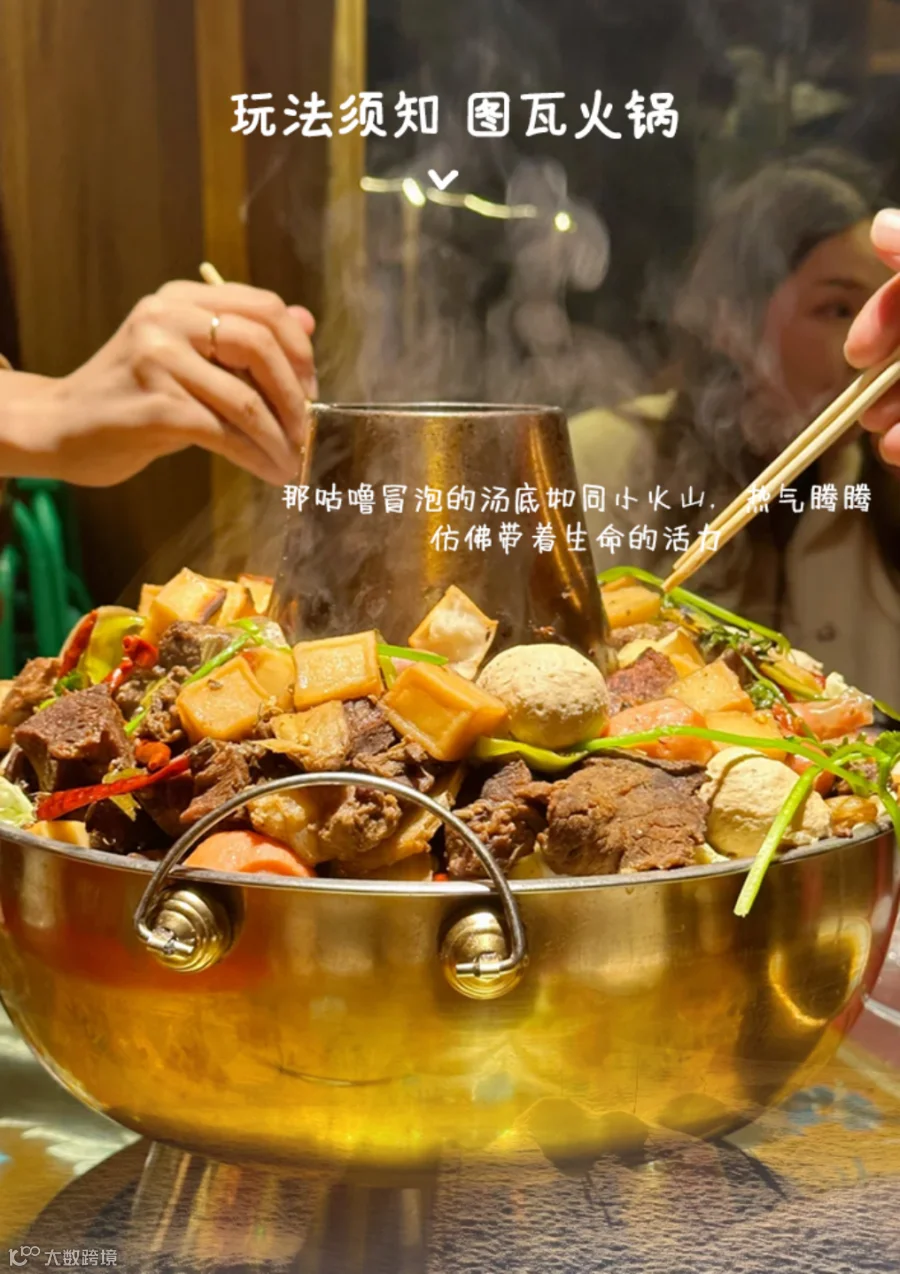特别安排图瓦人livehose+图瓦火锅:-30°的极致浪漫,是几位小伙伴坐在暖和的小木屋围炉而坐,牛羊肉在奶白色的骨汤里沉浮,蘸一筷子新疆辣皮子,冰天雪地瞬间被驯服。(提示:此项目为赠送项目,不吃不退哦)