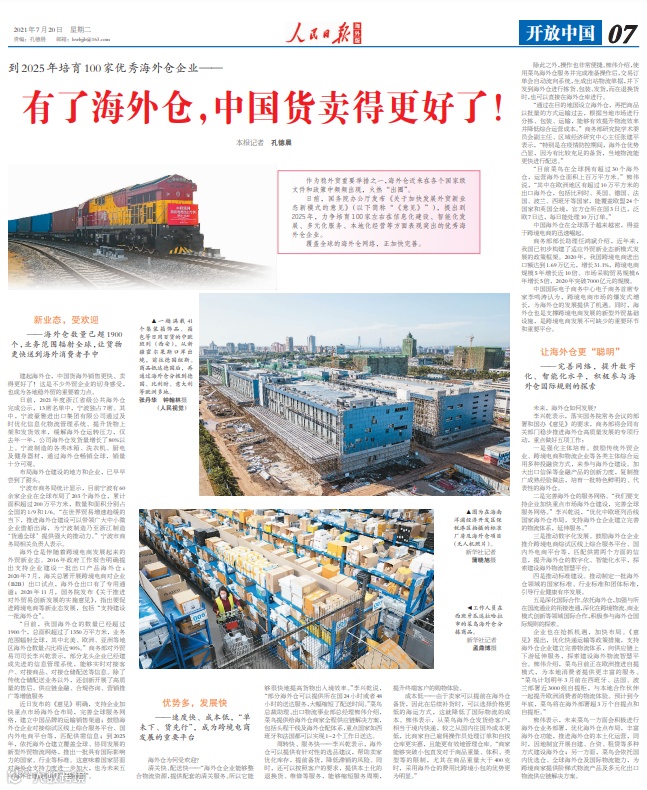 图为人民日报海外版(2021年07月20日第07版),文中提及宁波海外仓建设情况。