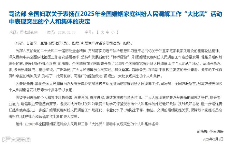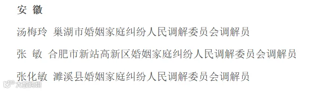 近日,司法部、全国妇联联合印发《关于表扬在2025年全国婚姻家庭纠纷人民调解工作“大比武”活动中表现突出的个人和集体的决定》。巢湖市汤梅玲同志凭借精湛业务能力和暖心调解成效成功入选,在全国舞台上展现了合肥婚调工作者的卓越风采,为我市婚姻家庭纠纷调解工作赢得了宝贵荣誉。