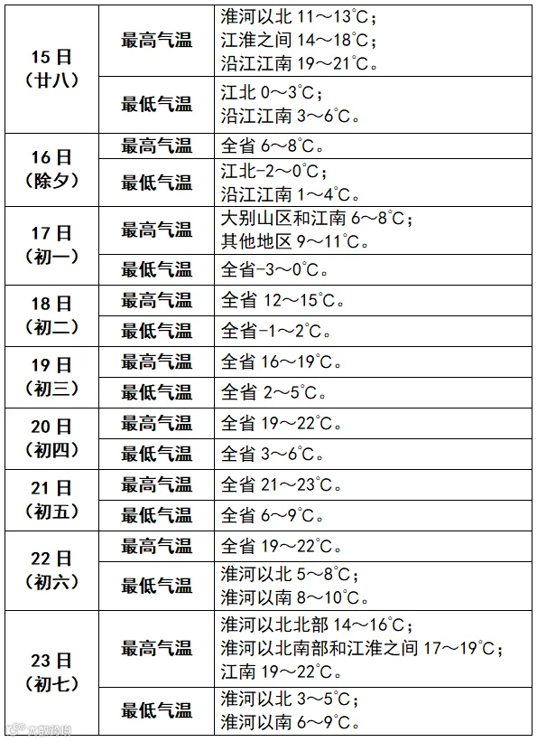 15-16日(廿八和除夕)受较强冷空气影响,全省平均气温将下降8~10℃,局部超过10℃;同时全省偏北风力增至4~5级,阵风7级左右。冷空气过后,17日(初一)早晨沿淮淮北和18日早晨全省大部分地区最低气温-3~0℃。18-22日(初二至初六)全省气温回升。23日(初七)还有一次冷空气影响我省。