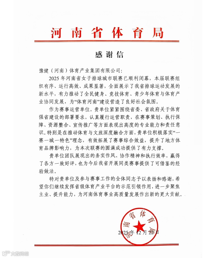 2025年12月22日,河南文旅投资集团二级子公司——豫健体育集团作为2025年河南省女子排球城市联赛唯一运营单位,荣获河南省体育局发来的感谢信,对豫健体育集团在联赛的工作成果予以高度评价和正式表扬。
