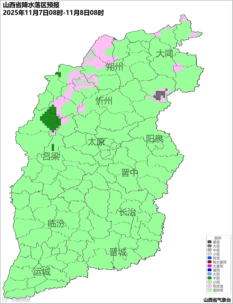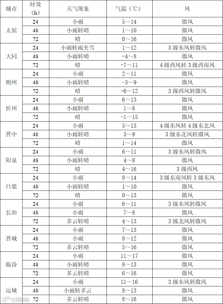 6日夜间到7日白天:阴天,有小到中雨,高寒山区有雨转雨夹雪,偏南风2-3级,部分地区3-4级,局地阵风6级以上,忻府区气温6到8℃。