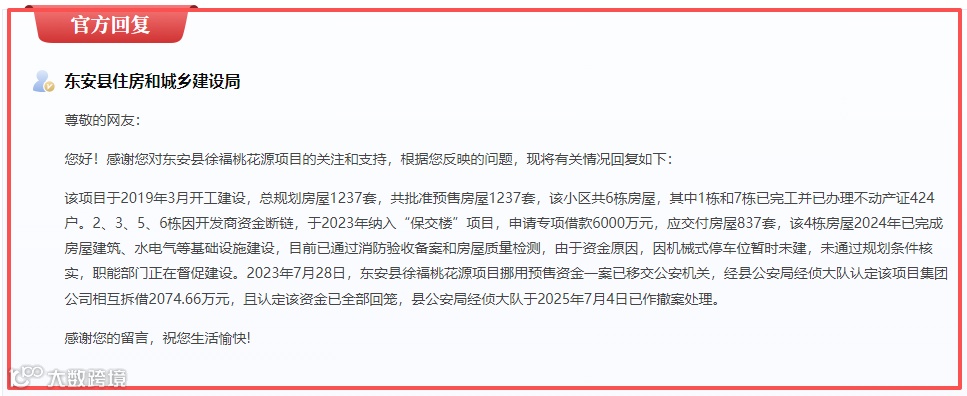 督促相关部门重启对开发商挪用预售资金的调查追责,东安项目审计已明确资金挪用事实,却被公安机关撤销案件,恳请彻查背后是否存在包庇行为,依法追究开发商及相关责任人法律责任,追回被挪用资金专项用于项目复工建设,立即叫停违规验收程序,责令开发商按规划设计标准限期补建缺失设施:东安项目需完成1185个机械停车位及人防相关设施建设,新田项目需尽快完成永久水电接驳、消防系统施工及公共配套修复,明确完整竣工交付的具体时间表与责任人,杜绝“表演性施工