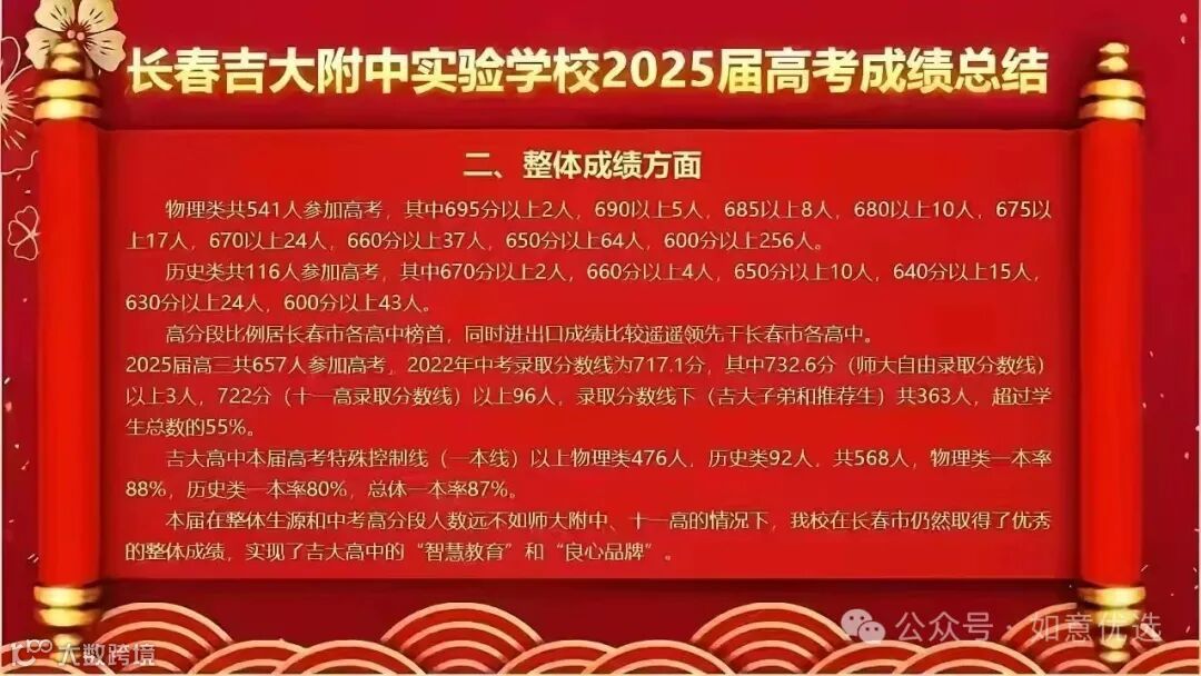 吉大附中本届高考特殊控制线(一本线)以上物理类476人,历史类92人,共568人。物理类一本率88%,历史类一本率80%,总体一本率87%。
