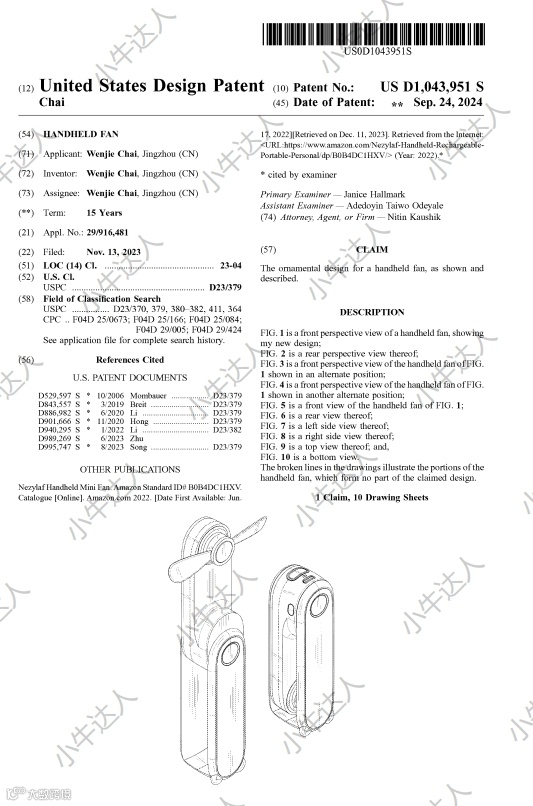 经查询,这款产品于2022年8月17日在美国进行外观专利申请的提交,于2024年9月24日获得了公告。