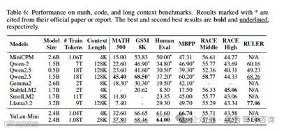 表6:数学、编程和长篇背景基准测试表现。带*标记的结果是从官方论文或报告中引用的。最佳和次佳结果分别用粗体和下划线标记。