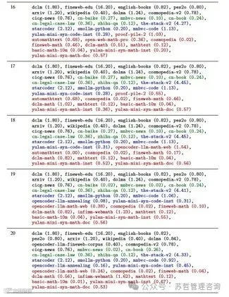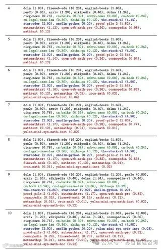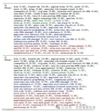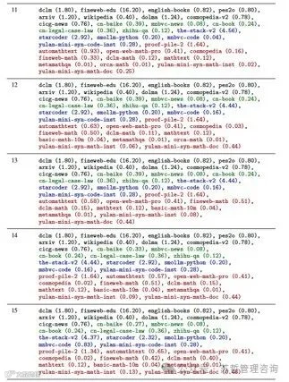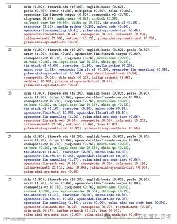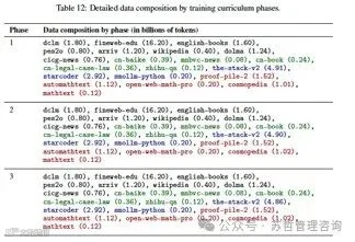 每个课程阶段数据的具体组成如表12所示,其中黑色代表英文网页和一般内容,绿色代表中文,蓝色代表代码,红色代表数学。第一阶段的前100亿标记在热身阶段使用。第一阶段的接下来30亿标记,以及第2至第25阶段,将在稳定训练阶段使用。第26和第27阶段构成退火阶段。