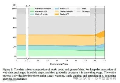 图9:数学、代码和一般数据的数据混合比例。我们在稳定阶段保持网页数据的比例不变,然后在退火阶段逐渐减少。整个过程分为三个主要阶段:热身、稳定训练和退火(即虚线之后开始)。