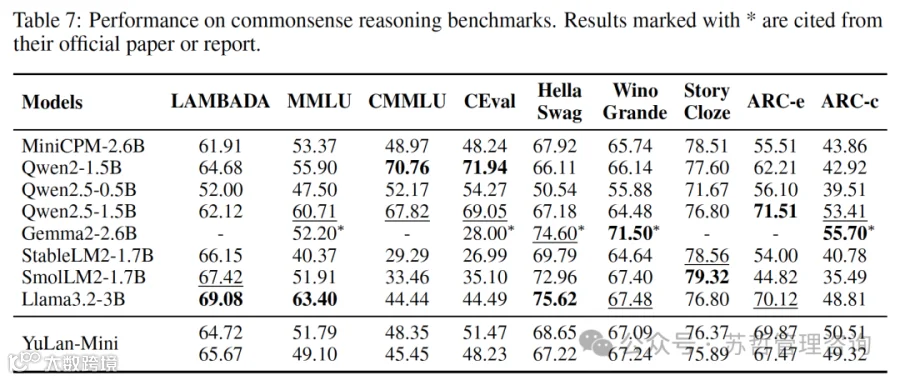 表格7:常识推理基准测试表现。带*标记的结果引自官方论文或报告。