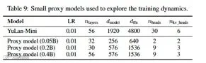 详细的架构设置在表9中列出。0.2B代理模型用于一般性的探索性实验,而0.05B和0.4B模型用于µP实验。后者代理模型与最终模型具有相同的层数。