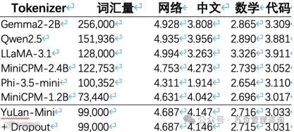 词汇量一般来说,应选择词汇量来平衡其对模型参数大小和效率的影响。我们采用了Dagan等人[2024年]提出的三种方法来平衡计算预算和词汇容量,得出最终约为99,000的词汇量。为简单起见,我们重用MiniCPM中的字节对编码(BPE)分词器[Hu等,2024年]。具体来说,我们通过应用相应的BPE合并规则来截断词汇,以减少标记数。我们还从词汇表中启发式地删除了罕见的领域特定标记,同时在词汇表中添加了一些保留标记。修改后的词汇表统计数据和压缩率如表2所示。进行标记化实验的测试集来源于各种数据集,详细列在第6.3节中。总体而言,我们的标记化方法在不同领域之间实现了一个良好平衡的压缩率。