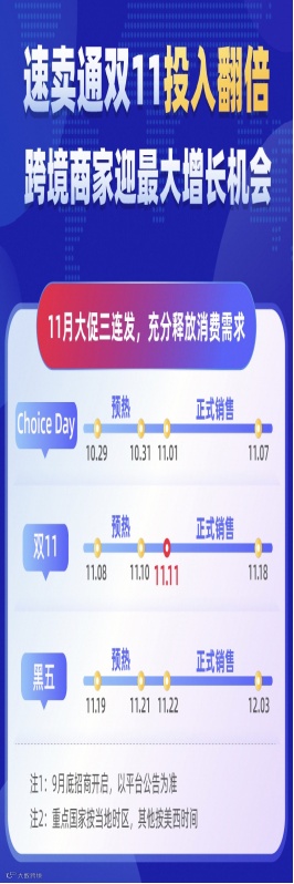 在此前的商家启动会上,速卖通宣布今年双11将于11月8日-11月10日预热3天,11月11日-11月18日正式售卖8天;黑五11月19日-11月21日预热3天,11月22日-12月3日正式售卖12天(均以重点国家当地时区为准)。