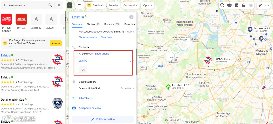 Yandex也是有地图服务的,跟谷歌地图类似的,然后我们先定位,比如我们要搜索莫斯科的客户,先定位到莫斯科,然后再输入产品关键词搜索就可以了,还是一样的,最好是用俄语搜最好。搜索出来之后就可以看到很多的公司,比如我搜索汽配的,然后搜出来的就都是汽配的,有公司名字、网站、电话这些有用的信息,然后俄罗斯用vk联系的人很多,大家也可以去注册一个vk,vk开发俄语区的客户是非常不错的。