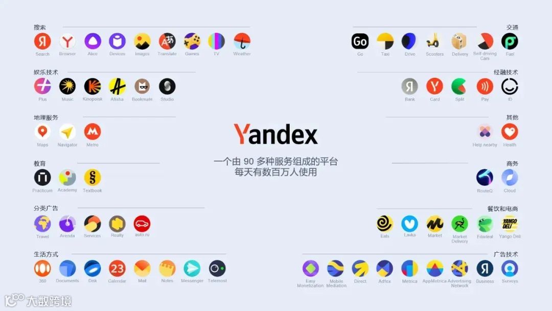 Yandex可以说是俄罗斯的百度+支付宝+新浪+滴滴+高德+美团+饿了吗+头条。以搜索引擎起家,目前Yandex旗下已经有30多种不同的应用,服务范围几乎涵盖所有行业,搜索引擎、在线广告、云存储服务、地图和导航、音乐流媒体、智能设备和技术、电商、支付、邮箱、交通、外卖、新闻、博客、网盘、翻译、浏览器等 。