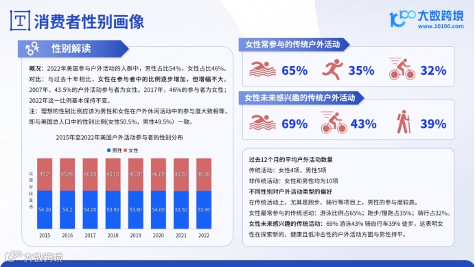 从2015年至2022年,女性在参与传统户外活动的比例上呈现逐年增长的趋势,尽管增长幅度相对平缓,但女性对传统户外活动的兴趣日益增加,预示着户外市场的存在一个新的潜在增长点。