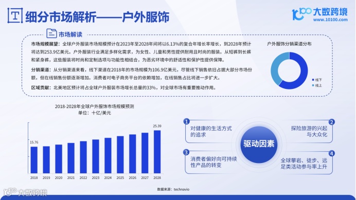 随着健康生活方式的普及、环保意识的提升以及户外活动的广泛推广而逐步扩展,也意味着全球消费者对户外产品的需求将持续增长,这为企业和投资者提供了巨大的商机。