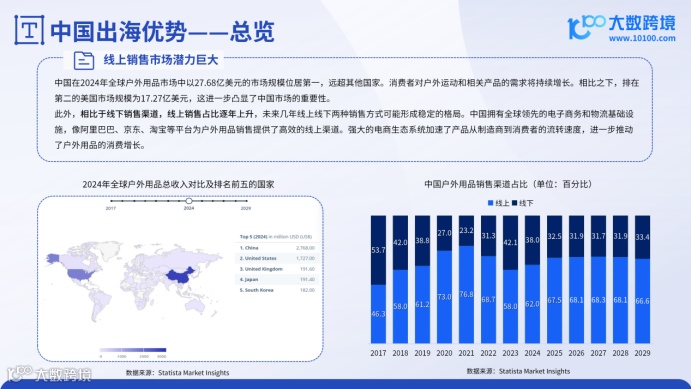 中国户外用品的线上销售市场潜力巨大,预计到2024年,中国在全球户外用品市场的收入将达到27.68亿美元,远超其他国家。