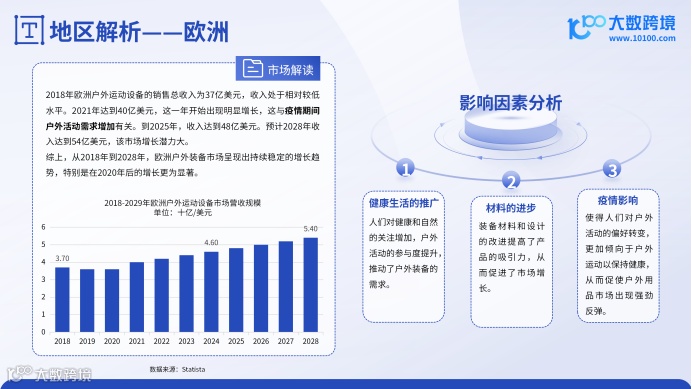 2018年欧洲户外运动设备的销售总收入为37亿美元,2021年达到40亿美元,这一年开始出现明显增长,这与疫情期间户外活动需求增加有关。预计2028年市场收入达到54亿美元,该市场增长潜力大。