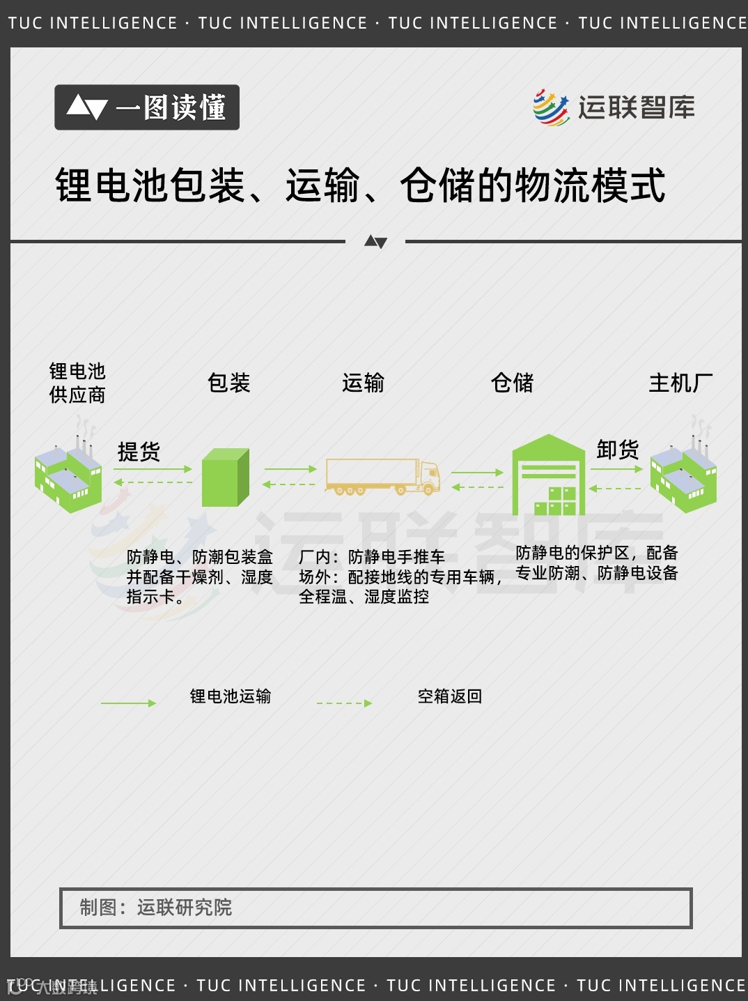 锂电池原材料运输前,会用泡沫包裹并采用防撞防水外包装,运输中避免挤压、潮湿和高温。而由于电解液的特殊属性,则常采用冷链保温车恒温运输。