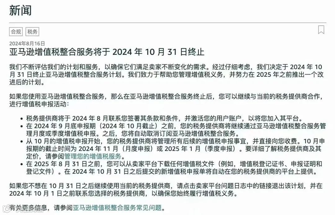 10月31日起,亚马逊终止增值税整合服务,将无法通过卖家平台管理增值税申报。