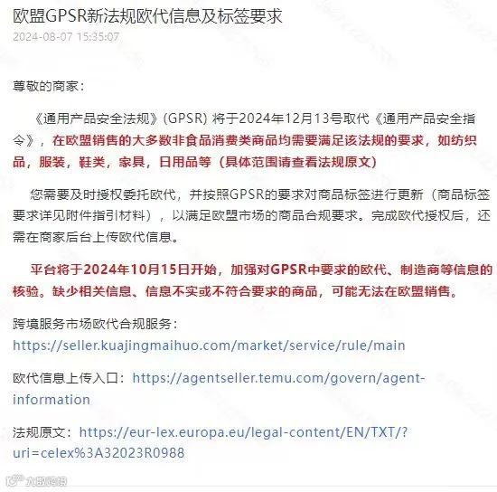 近期亚马逊、阿里巴巴国际站等多平台接二连三的强制欧/英代,有卖家已收到TEMU上传要求欧代的邮件。TEMU平台最新通知:将于2024年10月15日开始,加强对GPSR中要求的欧代、制造商等信息的核验。缺少相关信息、信息不实或不符合要求的商品,无法在欧盟销售!不管是TEMU还是亚马逊、速卖通、阿里巴巴,对产品的质检越来越严格,欧代英代将成为欧洲市场的通行证。未注册、未绑定、未贴标的卖家提高警惕!抓紧办理!(一定看到最后!小O呕心沥血给大家总结了几个欧代问得最多的问题,记得点赞收藏)
