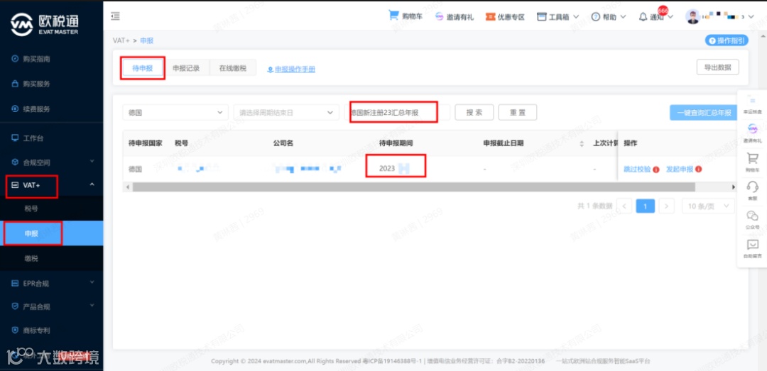 登录自己的欧税通系统,点击左侧【VAT+】--【申报】--【待申报】,在搜索框输入您需要申报的公司名或税号,选择【待申报期间】为2023的数据,点击【发起申报】。