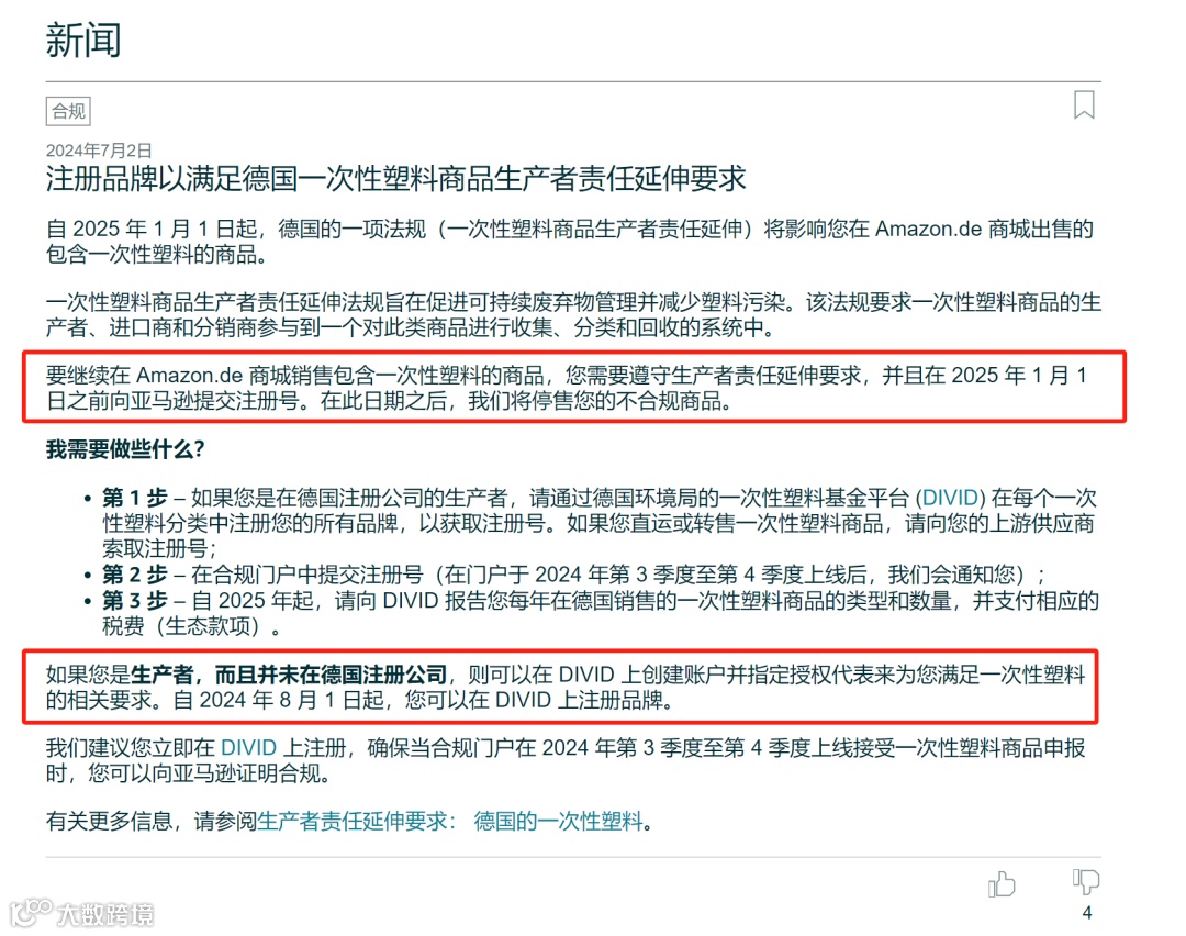 根据德国一次性塑料法(EWKFondsG)规定,生产商必须在2024年底前在德国联邦环境署(UBA)官网DIVID注册登记。建议所有涉及一次性塑料产品的卖家仔细核查产品和生产者状态,早日合规,避免影响店铺销售。