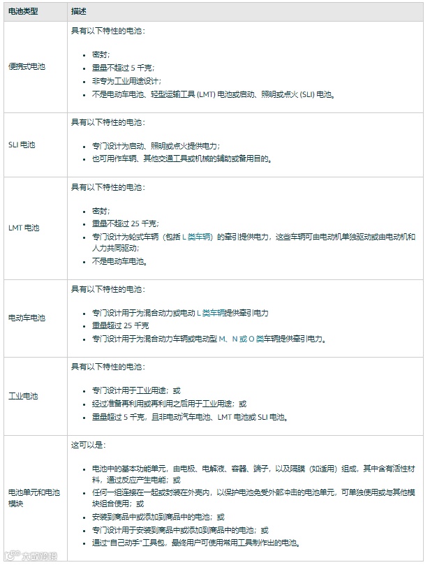 法规涵盖独立电池和商品中所含的电池,适用范围如下:
