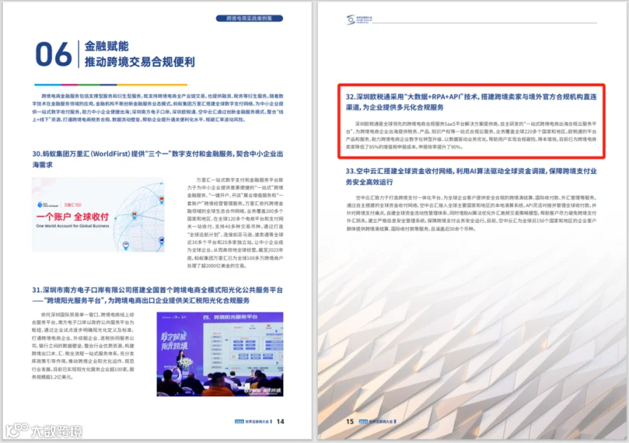 近日,世界互联网大会数字丝路发展论坛期间《世界互联网大会跨境电商实践案例集(2024年)》正式发布,共63个优秀案例,深圳跨境电商综试区共有12个案例入选,数量居全国第一。深圳欧税通技术有限公司(以下简称“欧税通”)“大数据+RPA+API”技术合规服务模式作为深圳优秀案例成功入选,成为全国唯一一家入选的跨境电商合规云服务企业。
