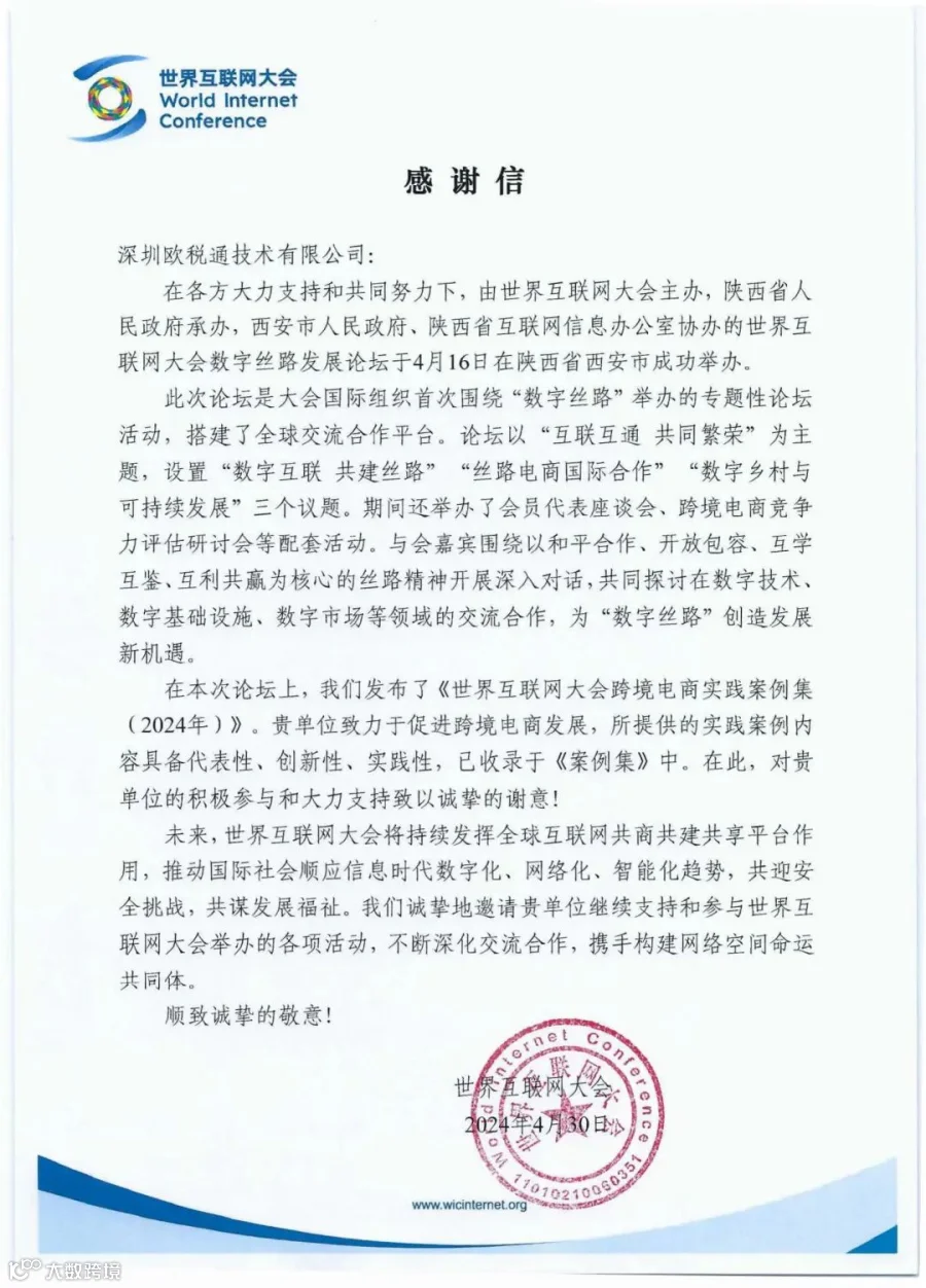 大会上,欧税通通过总结跨境电商实践案例的创新经验与模式,助力世界互联网大会提炼出创新实践的核心要素、成功模式和可复制的经验。