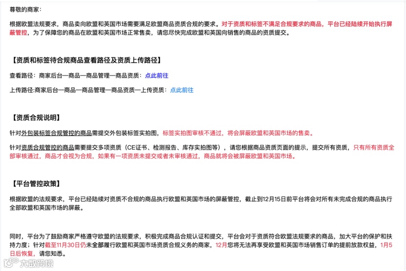 11月30日,未提交合规资质的卖家,12月将无法享受欧盟和英国市场销售订单的提前放款权益(1月5日恢复)。