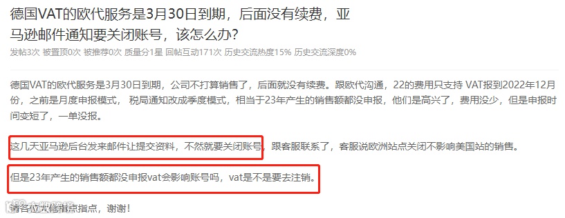 今天看到一个关于德国VAT税号的问题,卖家因为未续费服务,近期已经收到亚马逊邮件警告提交资料,不然关闭账号。对于德国站卖家2023年店铺产生的销售没有做VAT申报,会不会影响账号?要不要注销?