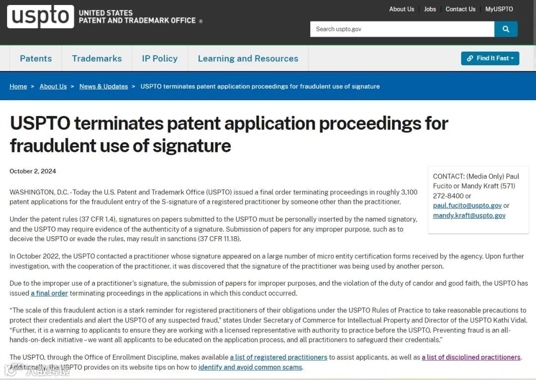 10月初突发消息!USPTO在其官网发布了一则处罚通知,宣布对大约3100件存在欺诈性使用签名行为的专利申请予以终止程序的处罚。这些专利涉及非注册执业者欺诈性地使用注册执业者的签名,此消息一出,立刻在行业内引起了广泛关注。