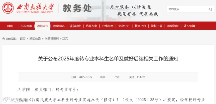 西南民族大学2025年转专业名单公示通知