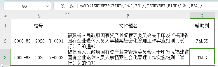 通过在Excel建立的辅助列输入公式“=AND(ISNUMBER(FIND("《",F2)),ISNUMBER(FIND("》",F2)))”(假设文件题名存放在F列),对比值TRUE为正确,对比值FALSE为异常,如图33。