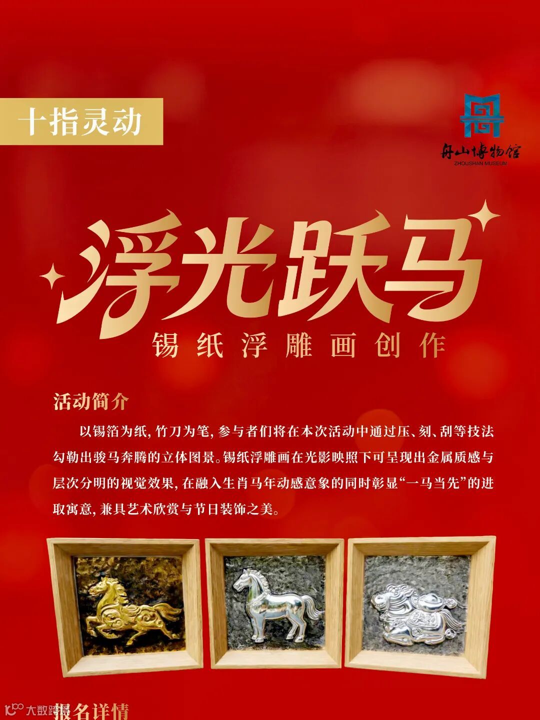 以锡箔为纸,竹刀为笔,参与者们将在本次活动中通过压、刻、刮等技法勾勒出骏马奔腾的立体图景。锡纸浮雕画在光影映照下可呈现出金属质感与层次分明的视觉效果,在融入生肖马年动感意象的同时彰显“一马当先”的进取寓意,兼具艺术欣赏与节日装饰之美。