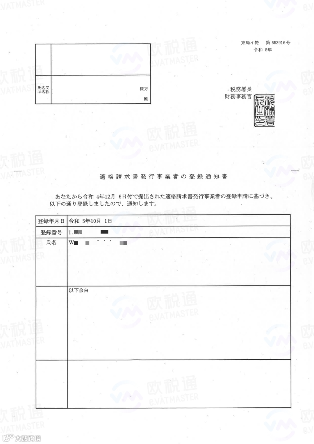 (欧税通日本JCT成功下号证书)