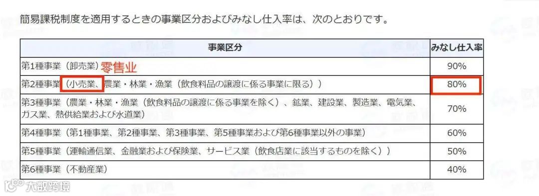 标准申报是凭票据进行进项抵扣,而简易申报是允许企业按照一个既定的采购系数进行申报。日本国税厅根据不同经营类型制定了不同采购系数,电商行业属于【零售类】,采购系数为 80% 。