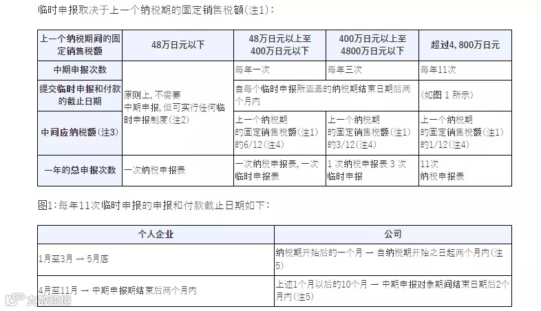 日本JCT的征税期原则上为一年申报一次。申报截止时间为纳税期截止之日起2个月内提交。但是次年开始根据上一个纳税期的销售税额,实行中期申报及纳税制度: