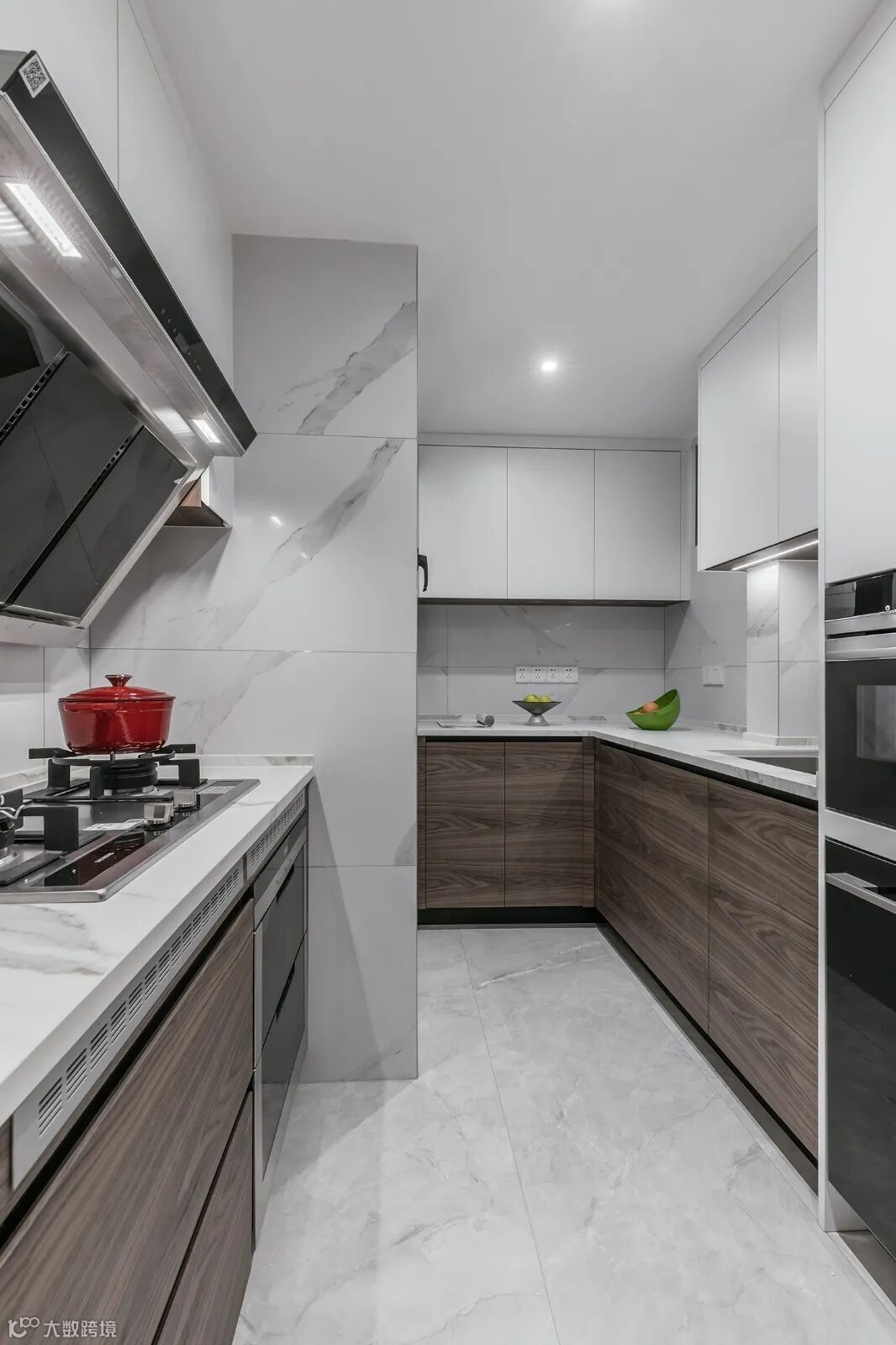 U型厨房动线设计,提高下厨的效率,采用大理石瓷砖铺设墙面地面,搭配原木矮柜、白色吊柜,嵌入式厨电,整个空间给人干爽洁净的感觉。