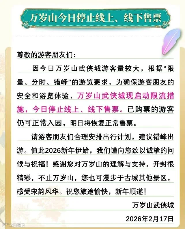 因今日万岁山武侠城游客量较大,根据限量、分时、错峰的游览要求,为确保游客朋友的安全和游览体验,万岁山武侠城现启动限流措施,今日停止线上、线下售票。已购票的游客仍可正常入园,明日将恢复正常售票。