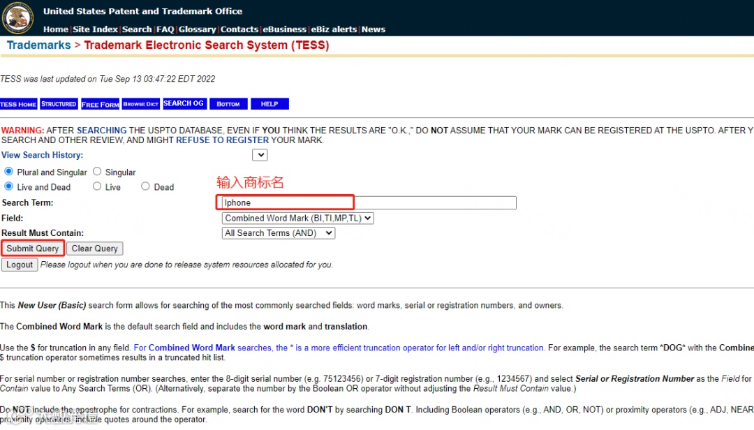 1)进入美国商标专利局官网,选择【Searching trademarks】-【Search our trademark database (TESS)】