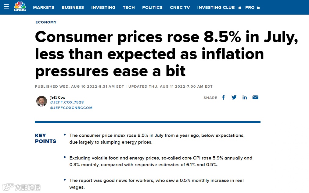 今年以来,美国市场通货膨胀的乌云难以散去。美国消费者新闻与商业频道(CNBC)8月10日消息称,美国劳工部数据显示,7月份美国通胀小幅回落至8.5%,但仍处于历史性高位。伴随着通胀飞涨,美国经济增长逐步放缓,滞胀风险如影随形。
