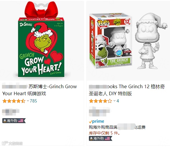 The Grinch(绿毛怪格林奇)是一部电影作品,目前在亚马逊上搜索“The Grinch”关键词,同样能看到很多“绿毛怪”周边。每年都有人因版权侵权被起诉,该动漫卡通形象均有版权保护,不建议使用!