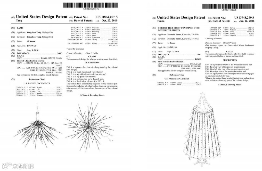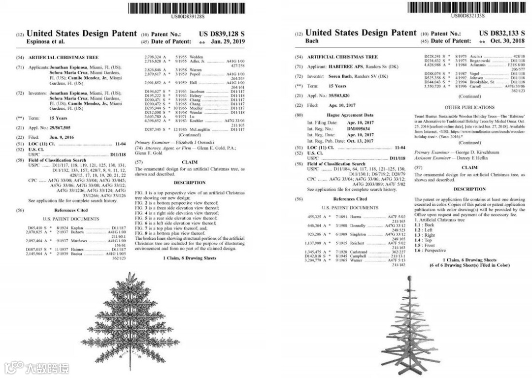 圣诞树是圣诞节最经典的装饰物,在亚马逊上搜索关键词,都是相关产品,但有不少已经申请了外观专利: